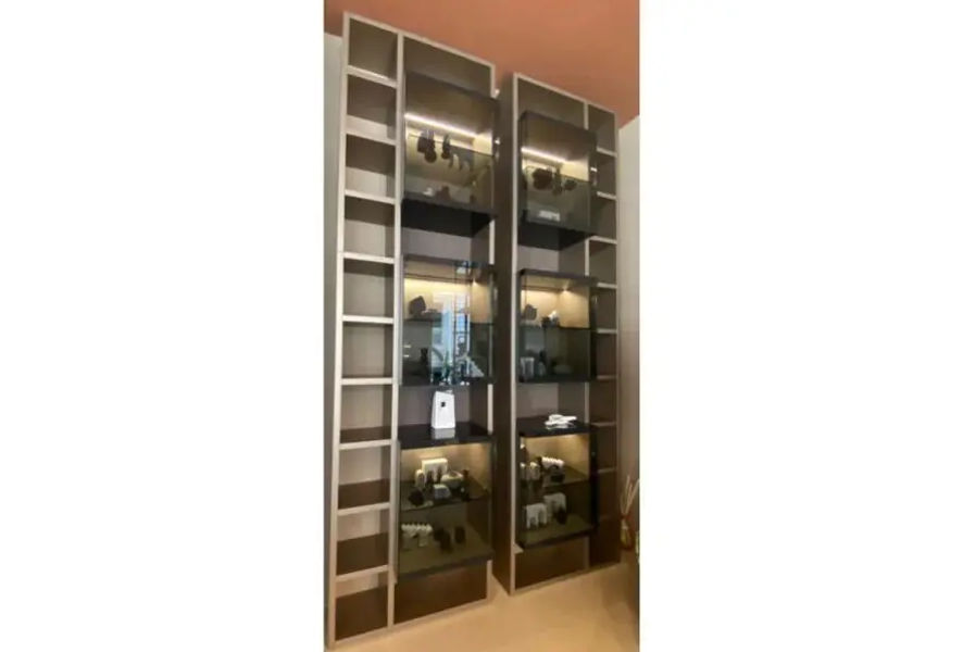 Questa libreria è offerta con una struttura in finitura laccato nickel, schienale in Fashion Wood Rovere Ghiro, un inserto vetrina sempre in laccato nickel e un'illuminazione interna funzionale.