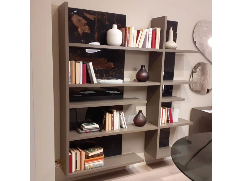 LIBRERIA CON SCHIENALE XGLASS LUCIDO GEODE E RIPIANI LACCATO HAVANA, LUCI LED